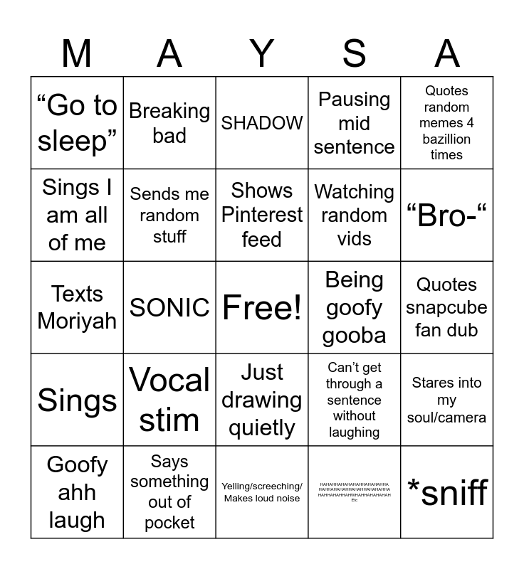 This bingo card has a free space and 24 words: Vocal stim, Says something out of pocket, Shows Pinterest feed, Goofy ahh laugh, Quotes random memes 4 bazillion times, “Go to sleep”, Sings I am all of me, Breaking bad, Being goofy gooba, Just drawing quietly, Watching random vids, Texts Moriyah, Can’t get through a sentence without laughing, Stares into my soul/camera, Sends me random stuff, HAHAHHAHAHAHAHHAHAHAHHA HAHHAHAHAHHAHAHHAHAHAHHA HAHHAHAHHAHWHAHHAHAHAHAH Etc, Quotes snapcube fan dub, SHADOW, “Bro-“, SONIC, *sniff, Sings, Pausing mid sentence and Yelling/screeching/ Makes loud noise.