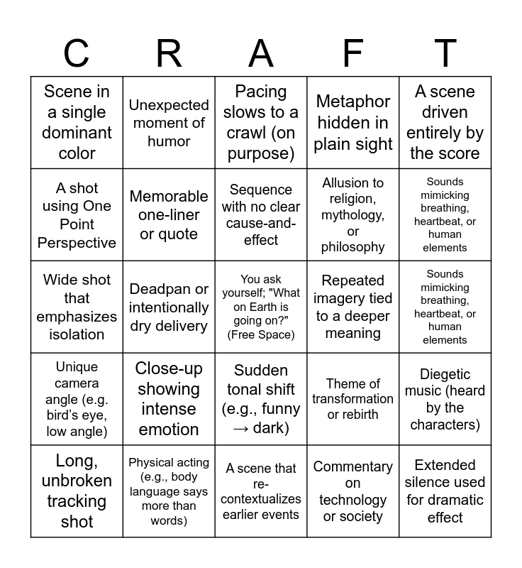 This bingo card has a free space and 24 words: Long, unbroken tracking shot, Close-up showing intense emotion, Sequence with no clear cause-and-effect, Commentary on technology or society, A scene driven entirely by the score, Scene in a single dominant color, Unexpected moment of humor, Pacing slows to a crawl (on purpose), Repeated imagery tied to a deeper meaning, Sounds mimicking breathing, heartbeat, or human elements, Wide shot that emphasizes isolation, Memorable one-liner or quote, Theme of transformation or rebirth, Diegetic music (heard by the characters), A shot using One Point Perspective, Physical acting (e.g., body language says more than words), A scene that re-contextualizes earlier events, Metaphor hidden in plain sight, Sounds mimicking breathing, heartbeat, or human elements, Unique camera angle (e.g. bird’s eye, low angle), Deadpan or intentionally dry delivery, Sudden tonal shift (e.g., funny → dark), Allusion to religion, mythology, or philosophy and Extended silence used for dramatic effect.