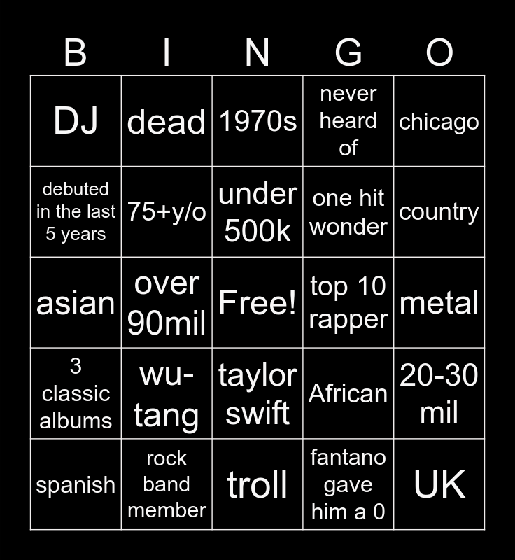 This bingo card has a free space and 24 words: wu-tang, rock band member, under 500k, spanish, chicago, DJ, debuted in the last 5 years, dead, top 10 rapper, taylor swift, one hit wonder, asian, African, 20-30 mil, 75+y/o, fantano gave him a 0, metal, 1970s, country, over 90mil, UK, 3 classic albums, never heard of and troll.