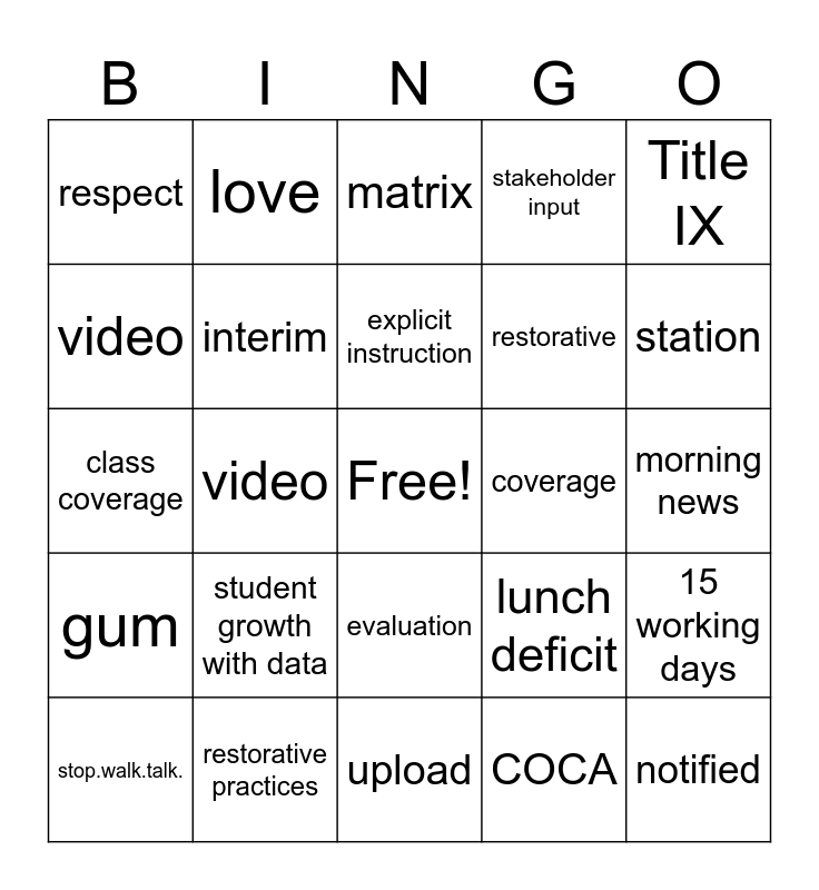 This bingo card has a free space and 24 words: student growth with data, restorative practices, explicit instruction, stop.walk.talk., Title IX, respect, video, love, coverage, evaluation, restorative, class coverage, lunch deficit, 15 working days, interim, COCA, morning news, matrix, station, video, notified, gum, stakeholder input and upload.