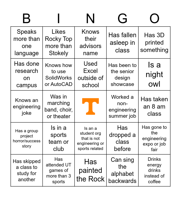 This bingo card has a free space and 36 words: Pulled an all-nighter for a class, Changed their major at least once, Knows how to use MATLAB or Python, Knows how to use SolidWorks or AutoCAD, Has dropped a class before, Has a group project horror/success story, Used Excel outside of school, Had an internship or co-op, Has 3D printed something, Can explain Ohm's Law, Was in marching band, choir, or theater, Has fallen asleep in class, Has been to office hours of more than 2 professors, Worked a non-engineering summer job, Is a night owl, Speaks more than one language, Knows the laws of thermo-dynamics, Is in a sports team or club, Drinks energy drinks instead of coffee, Knows their advisors name, Has taken an 8 am class, Has gone to the engineering expo or job fair, Has attended UT games of more than 3 sports, Has skipped a class to study for another, Has painted the Rock, Likes Rocky Top more than Stokely, Knows an engineering joke, Took the same EF class as you, Has been to the senior design showcase, Has done research on campus, Studied abroad or plans to, Likes TI-nspires better than TI-84s, Can sing the alphabet backwards, Is an a student org that is not engineering or sports related, Has the same major as you (or closely related) and Lives on the same floor as you.