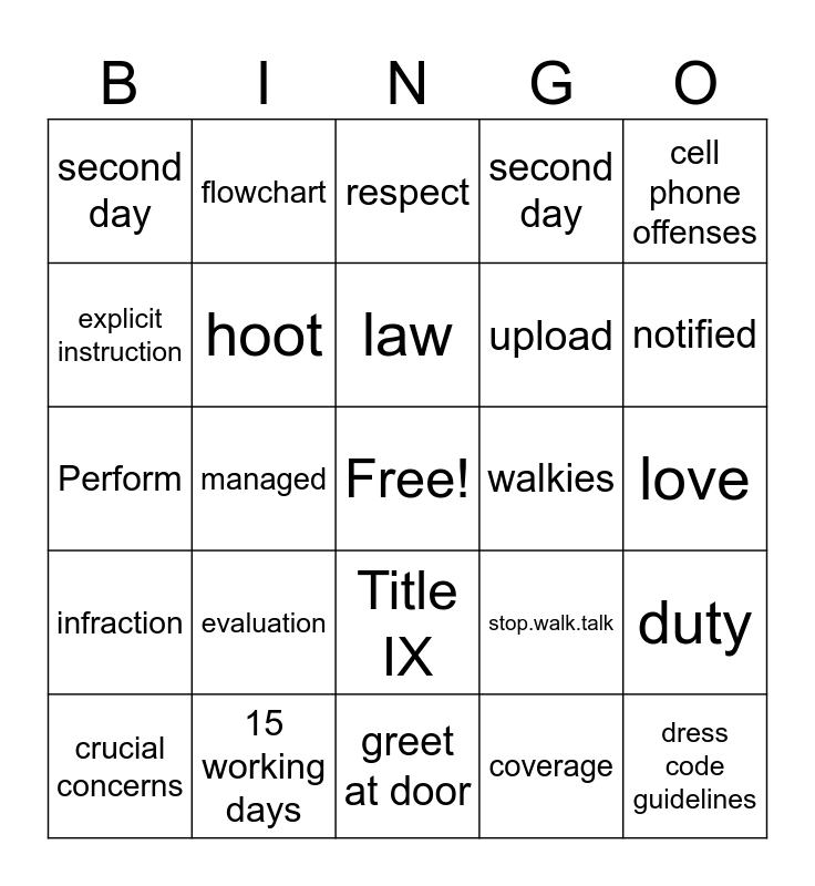 This bingo card has a free space and 24 words: evaluation, 15 working days, law, crucial concerns, cell phone offenses, second day, explicit instruction, flowchart, walkies, Title IX, upload, Perform, stop.walk.talk, duty, hoot, coverage, love, respect, notified, managed, dress code guidelines, infraction, second day and greet at door.
