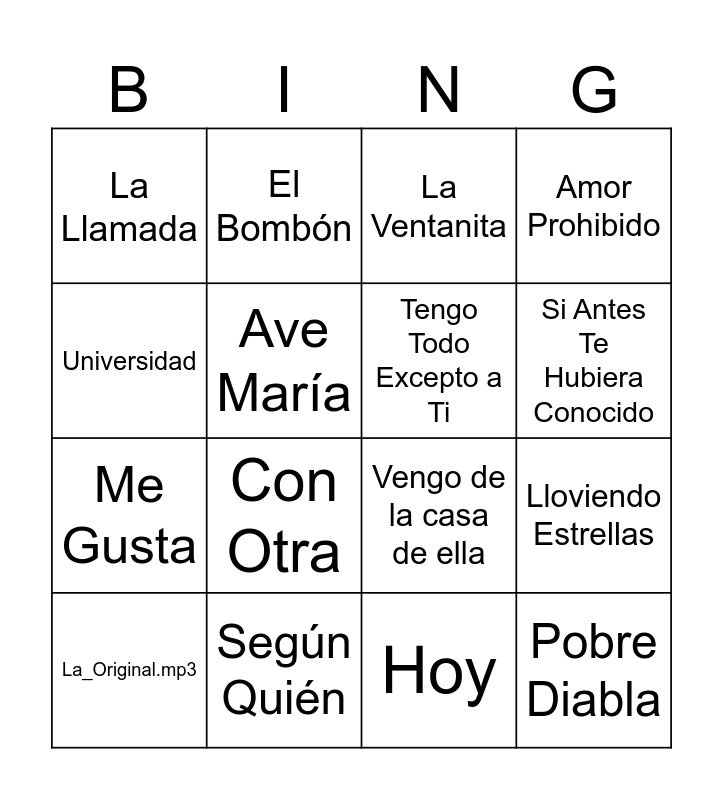 This bingo card has 51 words: Free!, La_Original.mp3, La Pollera Amarilla, Márchate ahora, Un Finde, No se ve, El Bombón, Azul, Ave María, Una Vida Pasada, Tengo Todo Excepto a Ti, Amor Prohibido, Mi Vestido Azul, Niña Bonita, Como la Flor, Corazon de Miel, Si Antes Te Hubiera Conocido, Según Quién, La Curiosidad, Universidad, Lloviendo Estrellas, Corazon Mentiroso, La Llamada, Me Gusta, DtMF, Tití Me Preguntó, Con Otra, Sera Que No Me Amas, No Se Vale, La Ventanita, Flores Amarillas, Nena, Ocho cuarenta, Suave, Amor Clasificado, A Don Ata, La Triple T, Dejaría Todo, La Chica Del Bikini Azul, Ciega, Sordomuda, Hoy, Pobre Diabla, Que lloro, Voy a Olvidarme de Mí, Me Enamoré, Fuiste, Vengo de la casa de ella, Pideme la Luna, SINVERGÜENZA, DESPECHÁ and APT.