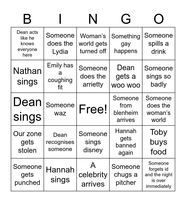 This bingo card has a free space and 24 words: Dean recognises someone, Hannah sings, Someone does the arrietty, Someone gets punched, Someone spills a drink, Dean acts like he knows everyone here, Nathan sings, Someone does the Lydia, Someone from blenheim arrives, Someone sings disney, Dean gets a woo woo, Dean sings, Hannah gets banned again, Toby buys food, Emily has a coughing fit, Someone chugs a pitcher, Someone does the woman’s world, Woman’s world gets turned off, Someone sings so badly, Someone waz, Someone forgets id and the night is over immediately, Our zone gets stolen, Something gay happens and A celebrity arrives.