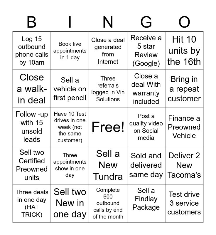 This bingo card has a free space and 24 words: Three appointments show in one day, Sell two New in one day, Three referrals logged in Vin Solutions, Three deals in one day (HAT TRICK), Hit 10 units by the 16th, Log 15 outbound phone calls by 10am, Close a walk-in deal, Book five appointments in 1 day, Post a quality video on Social media, Sell a New Tundra, Close a deal With warranty included, Follow -up with 15 unsold leads, Sold and delivered same day, Deliver 2 New Tacoma's, Sell a vehicle on first pencil, Sell a Findlay Package, Finance a Preowned Vehicle, Close a deal generated from Internet, Bring in a repeat customer, Have 10 Test drives in one week (not the same customer), Test drive 3 service customers, Sell two Certified Preowned units, Receive a 5 star Review (Google) and Complete 600 outbound calls by end of the month.