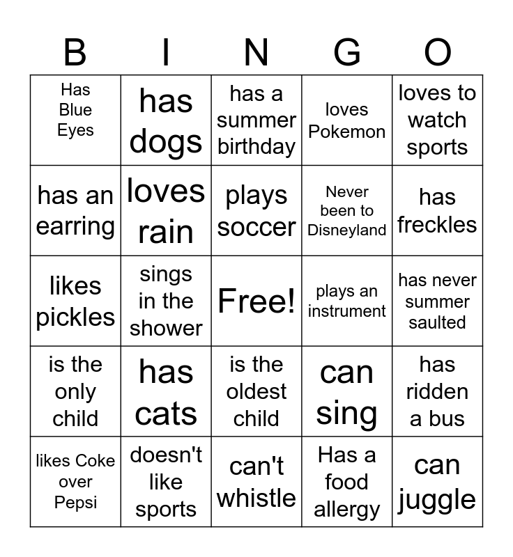 This bingo card has a free space and 47 words: likes Justin Beiber, can juggle, likes pizza more than fries, can't whistle, has cats, doesn't like chocolate, has dogs, doesn't eat breakfast, has an earring, has more than twp siblings, loves rain, loves Pokemon, has ridden a bus, can sing, never had a cavity, hates snow, plays soccer, plays an instrument, likes cats better than dogs, loves to watch sports, sings in the shower, Has a food allergy, Has Blue Eyes, Never been to Disneyland, likes dogs better than cats, has freckles, likes Coke over Pepsi, is the youngest child, is the oldest child, is the only child, enjoys cooking, is left handed, likes to read, hates spiders, doesn't drink soda, doesn't like sports, has never summer saulted, can count in another language, likes to swim, likes to play baseball, has baked cookies, has a summer birthday, likes pickles, owns a skateboard, likes scary movies, likes math and hates math.