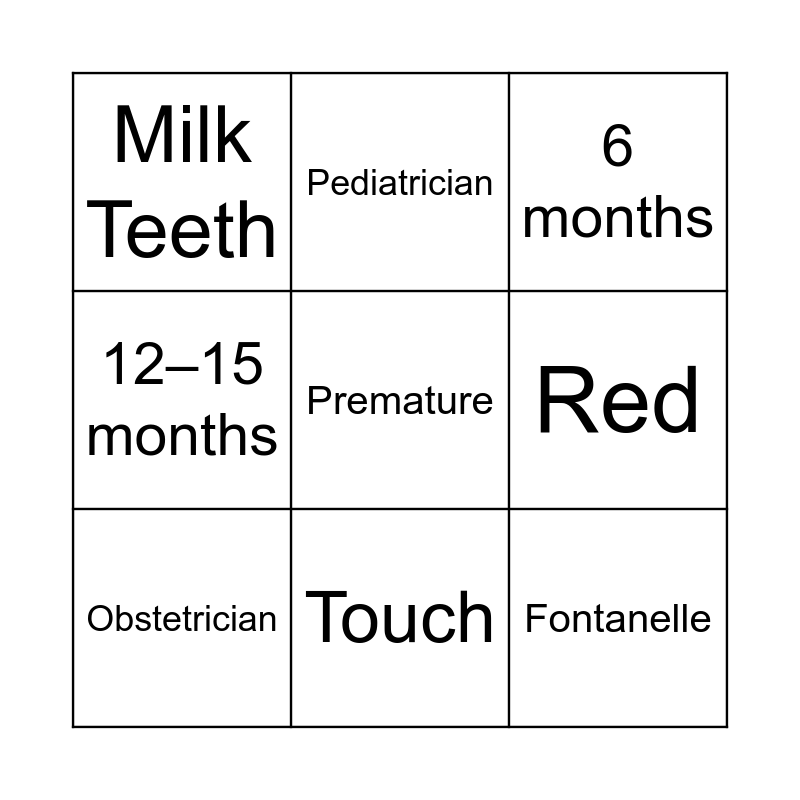 This bingo card has 11 words: Fontanelle, Touch, Premature, Obstetrician, Pediatrician, 6 months, Red, 8–12 diapers, 12–15 months, Milk Teeth and Crib.