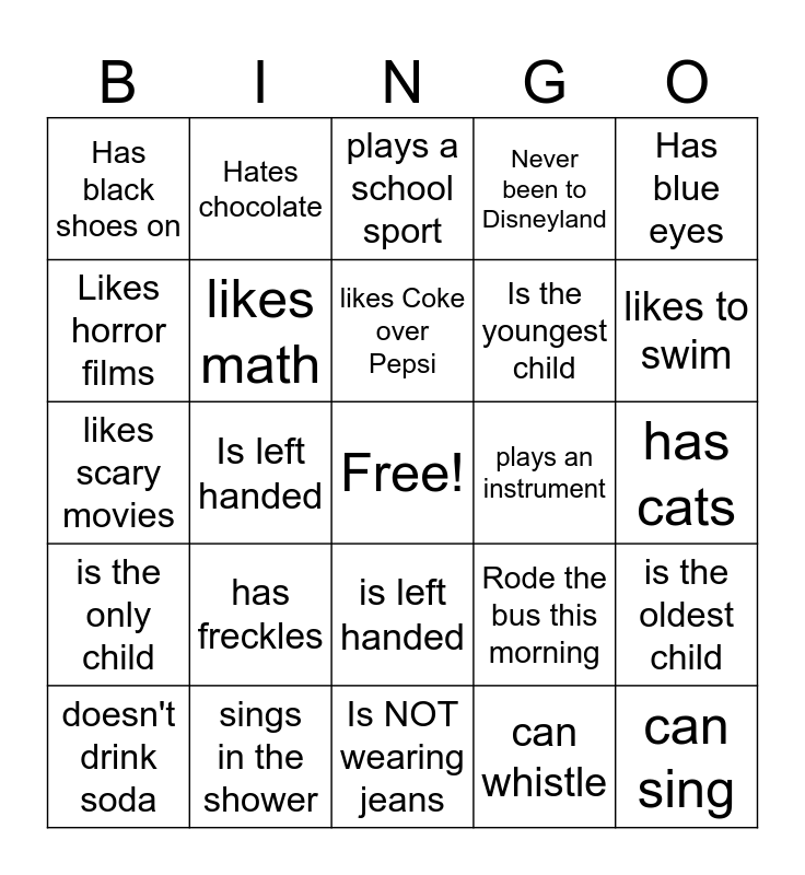 This bingo card has a free space and 49 words: Never played Minecraft, can juggle, likes pineapple on a pizza, can whistle, has cats, Went camping during the summer break, Hates chocolate, Has a food allergy, Is the youngest child, has more than two siblings, Likes horror films, Is left handed, Rode the bus this morning, can sing, never had a cavity, Likes Pepsi more than Coke, plays a school sport, plays an instrument, Never left the country, Has black shoes on, sings in the shower, Is NOT wearing jeans, Never been to Disneyland, Has blue eyes, likes dogs better than cats, has freckles, likes Coke over Pepsi, is the youngest child, is the oldest child, is the only child, enjoys cooking, is left handed, likes to read, hates spiders, doesn't drink soda, doesn't like sports, has never summer saulted, can count in another language, likes to swim, likes to play baseball, has baked cookies, has a summer birthday, likes pickles, owns a skateboard, likes scary movies, likes math, hates math, likes Justin Beiber and likes Justin Beiber.