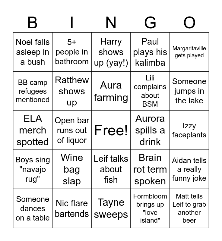 This bingo card has a free space and 41 words: Line dancing, ELA merch spotted, Maddy mentions shrimp, Ratthew shows up, Nic flare bartends, Leif talks about fish, Aura farming, Staff house member mentions mice, Margaritaville gets played, Boys sing "navajo rug", Open bar runs out of liquor, Paul plays his kalimba, Matt tells Leif to grab another beer, Izzy faceplants, Aurora spills a drink, Wine bag slap, Someone yaks, Noel falls asleep in a bush, Alex loses something, Harry shows up (yay!), Aidan tells a really funny joke, Lauren hates on "the summer i turned pretty", Tayne sweeps, Lili complains about BSM, Someone shows off their henna, Medina drinks kombucha, Formbloom brings up "love island", Everyone on the stage at once, Someone jumps in the lake, Someone mentions iron human, Someone trips on beach house trail, 5+ people in bathroom, Someone dances on a table, Sean says he wants to dance, Brain rot term spoken, BB camp refugees mentioned, Paul plays his kalimba, Plastics talks about 24hr sampling, Mullet, Collette sprains her ankle (again) and Pat gets an incriminating photo taken.