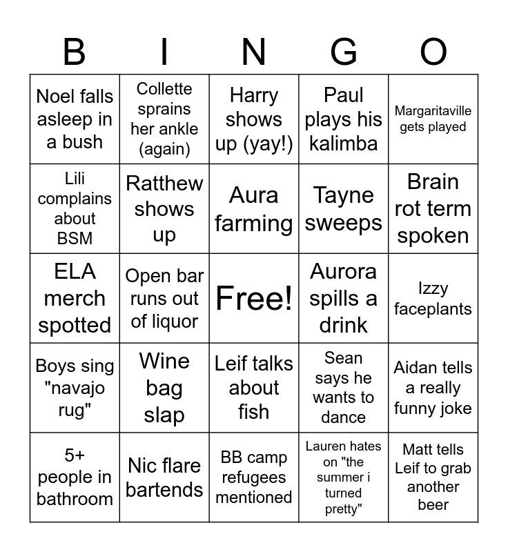 This bingo card has a free space and 40 words: Line dancing, ELA merch spotted, Maddy mentions shrimp, Ratthew shows up, Nic flare bartends, Leif talks about fish, Aura farming, Staff house member mentions mice, Margaritaville gets played, Boys sing "navajo rug", Open bar runs out of liquor, Paul plays his kalimba, Matt tells Leif to grab another beer, Izzy faceplants, Aurora spills a drink, Wine bag slap, Someone yaks, Noel falls asleep in a bush, Alex loses something, Harry shows up (yay!), Aidan tells a really funny joke, Lauren hates on "the summer i turned pretty", Tayne sweeps, Lili complains about BSM, Someone shows off their henna, Medina drinks kombucha, Formbloom brings up "love island", Everyone on the stage at once, Someone jumps in the lake, Someone mentions iron human, Someone trips on beach house trail, 5+ people in bathroom, Someone dances on a table, Sean says he wants to dance, Brain rot term spoken, BB camp refugees mentioned, Plastics talks about 24hr sampling, Mullet, Collette sprains her ankle (again) and Pat gets an incriminating photo taken.