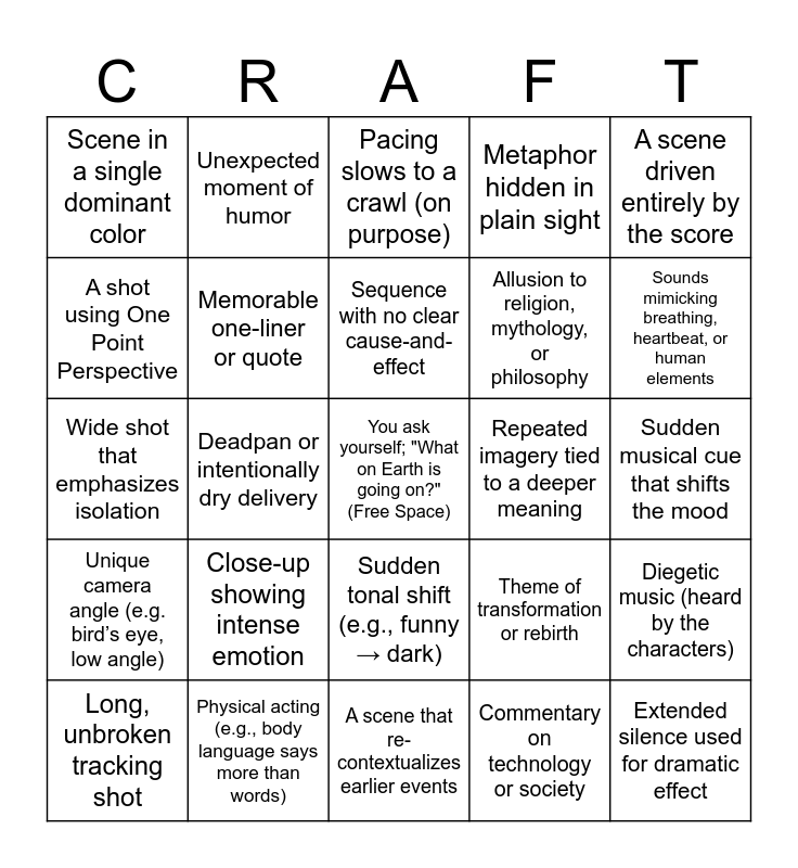 This bingo card has a free space and 24 words: Long, unbroken tracking shot, Close-up showing intense emotion, Sequence with no clear cause-and-effect, Commentary on technology or society, A scene driven entirely by the score, Scene in a single dominant color, Unexpected moment of humor, Pacing slows to a crawl (on purpose), Repeated imagery tied to a deeper meaning, Sudden musical cue that shifts the mood, Wide shot that emphasizes isolation, Memorable one-liner or quote, Theme of transformation or rebirth, Diegetic music (heard by the characters), A shot using One Point Perspective, Physical acting (e.g., body language says more than words), A scene that re-contextualizes earlier events, Metaphor hidden in plain sight, Sounds mimicking breathing, heartbeat, or human elements, Unique camera angle (e.g. bird’s eye, low angle), Deadpan or intentionally dry delivery, Sudden tonal shift (e.g., funny → dark), Allusion to religion, mythology, or philosophy and Extended silence used for dramatic effect.