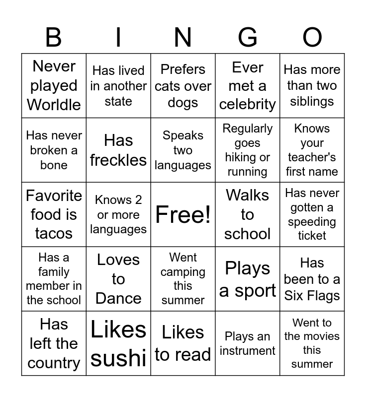 This bingo card has a free space and 25 words: Loves to Dance, Likes to read, Speaks two languages, Has left the country, Has more than two siblings, Never played Worldle, Has never broken a bone, Has lived in another state, Walks to school, Went camping this summer, Regularly goes hiking or running, Favorite food is tacos, Plays a sport, Has been to a Six Flags, Has freckles, Has a Duelingo streak over 30, Has never gotten a speeding ticket, Prefers cats over dogs, Knows your teacher's first name, Knows 2 or more languages, Went to the movies this summer, Likes sushi, Has a family member in the school, Ever met a celebrity and Plays an instrument.