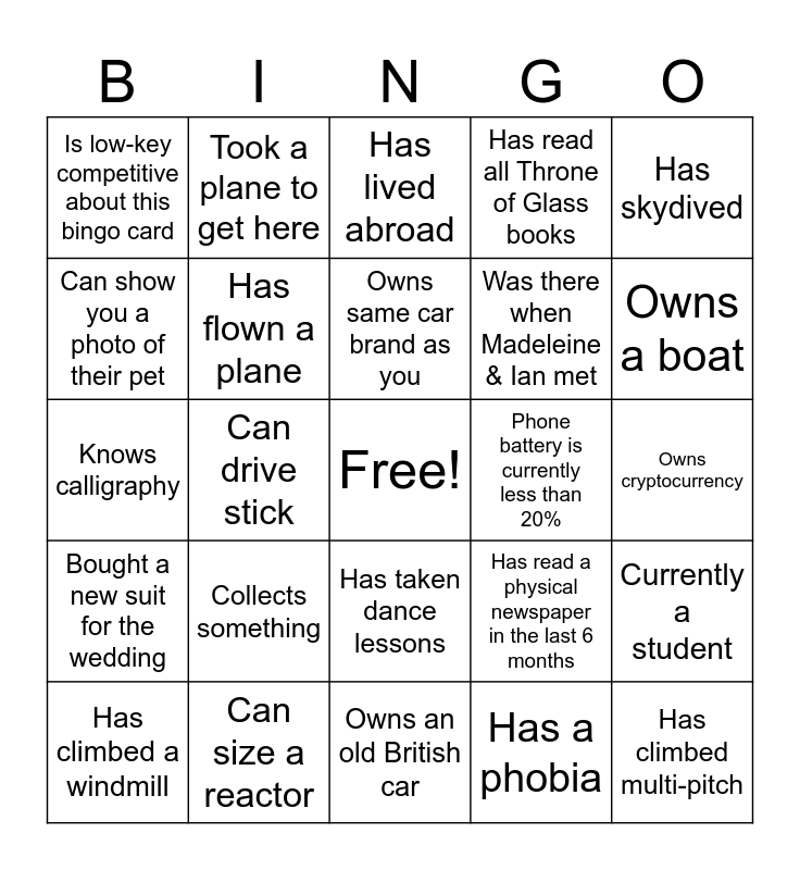 This bingo card has a free space and 42 words: Same birth month as you, Owns same car brand as you, Knows how to tie a bowline, Collects something, Has a phobia, Currently a student, Has climbed multi-pitch, Visited 5 continents, Has lived abroad, Has taken dance lessons, Owns cryptocurrency, Owns a boat, Can drive stick, Has skydived, Has run a marathon, Has read a physical newspaper in the last 6 months, Can do a cartwheel, Knows calligraphy, Went to Taylor Swift Eras concert, Took a plane to get here, Can show you a photo of their pet, Has a PhD, Shares a name with someone in the wedding party, Is low-key competitive about this bingo card, Rides bike to work, Was a summer camp instructor, Was there when Madeleine & Ian met, Is wearing their iron ring, Knew the couple before they were a couple, Knows the wedding itinerary as well as Madeleine, Got a professional manicure for this wedding, Bought a new suit for the wedding, Has flown a plane, Owns an old British car, Was part of a robotics team, Has climbed a windmill, Can size a reactor, Phone battery is currently less than 20%, Is in the medical field, Has broken down on the side of the road, Has read all Throne of Glass books and Has grown corn.