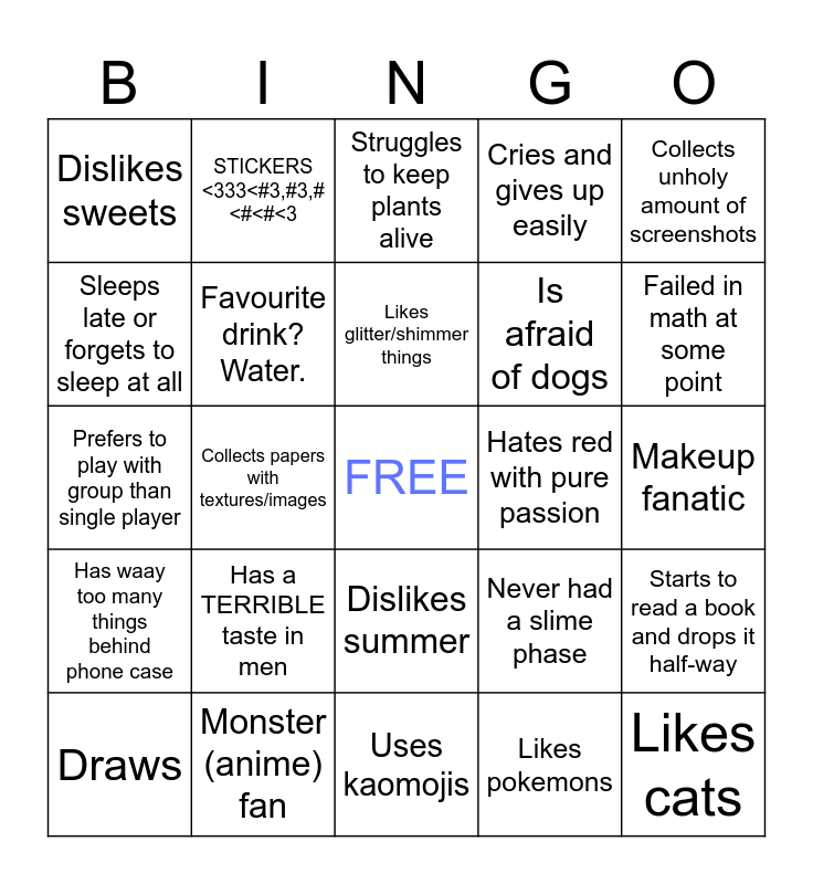 This bingo card has a free space and 24 words: Has a TERRIBLE taste in men, Monster (anime) fan, Likes glitter/shimmer things, Draws, Collects unholy amount of screenshots, Dislikes sweets, Sleeps late or forgets to sleep at all, STICKERS <333<#3,#3,#<#<#<3, Hates red with pure passion, Dislikes summer, Is afraid of dogs, Prefers to play with group than single player, Never had a slime phase, Starts to read a book and drops it half-way, Favourite drink? Water., Likes pokemons, Makeup fanatic, Struggles to keep plants alive, Failed in math at some point, Collects papers with textures/images, Likes cats, Has waay too many things behind phone case, Cries and gives up easily and Uses kaomojis.