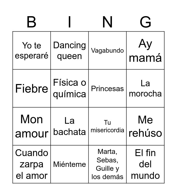 This bingo card has 38 words: Free!, Si te pillara, Nuevayol, Princesas, Zapatillas, Si antes te hubiera conocido, La morocha, Bailando, Fiebre, Mon amour, Me rehúso, Ay mamá, Cuando zarpa el amor, Marta, Sebas, Guille y los demás, Física o química, El fin del mundo, Bailando por ahí, Vagabundo, Formentera, Miénteme, Yo te esperaré, Tacones rojos, La bachata, Rosas, Olivia, 2 AM, Jesucristo Basta, Sera perche ti amo, La mujer de verde, Te voy a esperar, Purpurina, Viva la vida, A sky full of stars, Dancing queen, DtMf, Gimme Gimme Gimme, Tu misericordia and La llamada.