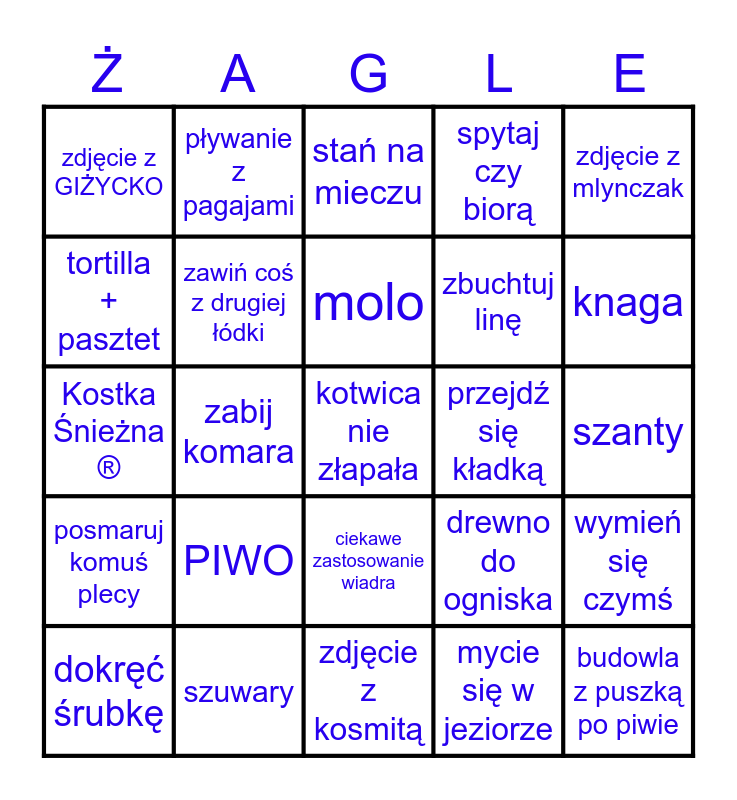 This bingo card has a free space and 24 words: PIWO, szuwary, molo, dokręć śrubkę, zdjęcie z mlynczak, zdjęcie z GIŻYCKO, tortilla + pasztet, pływanie z pagajami, przejdź się kładką, ciekawe zastosowanie wiadra, zbuchtuj linę, Kostka Śnieżna ®, drewno do ogniska, wymień się czymś, zawiń coś z drugiej łódki, mycie się w jeziorze, szanty, stań na mieczu, knaga, zabij komara, budowla z puszką po piwie, posmaruj komuś plecy, spytaj czy biorą and zdjęcie z kosmitą.