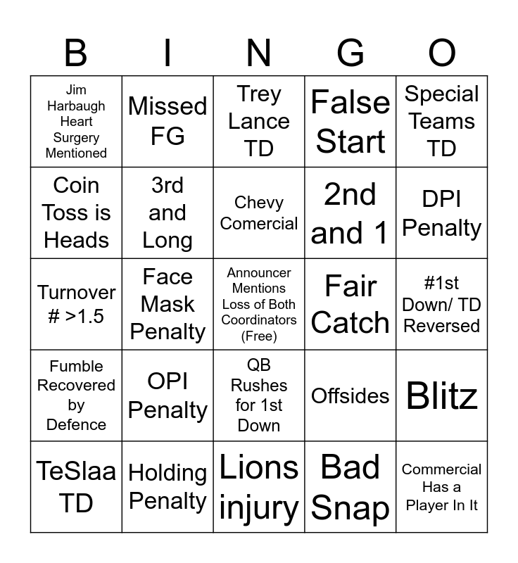 This bingo card has a free space and 45 words: Hooker TD, Commercial Has a Player In It, Game Tied, Not 0-0, TeSlaa TD, Trisha Screams, Bad Snap, Trey Lance TD, TD Celebration Dance, Special Teams TD, Holding Penalty, False Start, Fair Catch, QB Rushes for 1st Down, OPI Penalty, Rushing TD # >2.5, Lions injury, Kyle Allen TD, Turnover # >1.5, 4th Down Conversion, DPI Penalty, Missed FG, >3.5 Sacks, Cheerleader Cam, Jim Harbaugh Heart Surgery Mentioned, Coach's Challenge, #1st Down/ TD Reversed, Referees Booed, Coach Yelling on Sideline About Call, Offsides, Fumble Recovered by Defence, 2-pt Attempt, Blitz, Safety, Canton Skyline, Last Play Kneel- Down, Face Mask Penalty, Timeouts Remaining at End of Half, Player Points for 1st Down, Ford Comercial, Chevy Comercial, Coin Toss is Heads, 2nd and 1, Something Political Comes Up, 3rd and Long and Pick 6.