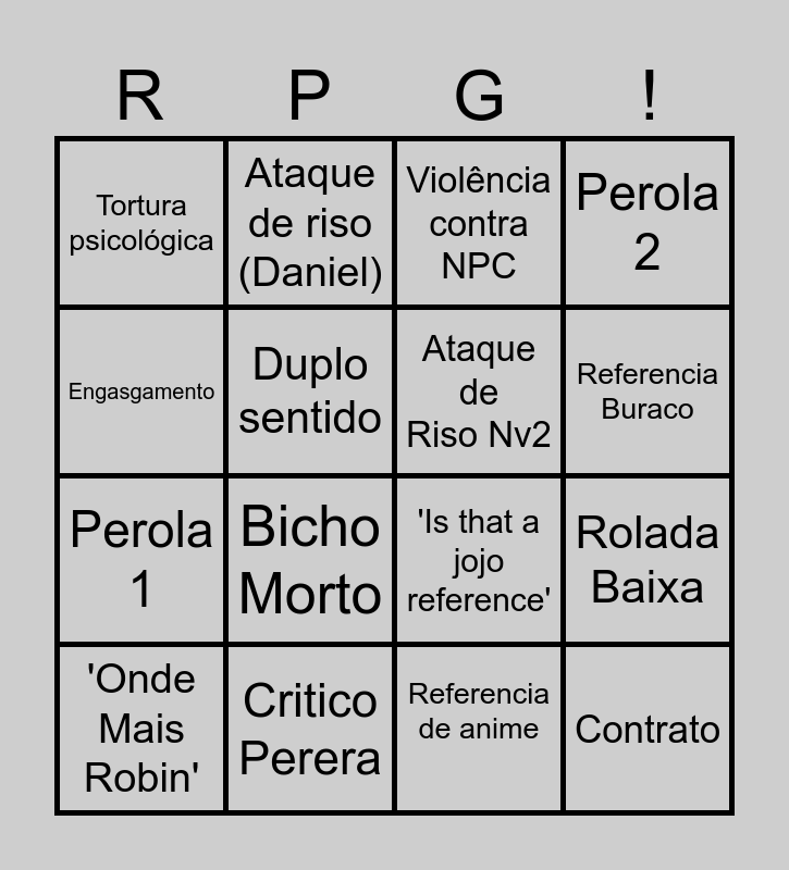 This bingo card has 16 words: Critico Perera, Rolada Baixa, Violência contra NPC, Tortura psicológica, Perola 1, Ataque de riso (Daniel), 'Is that a jojo reference', Referencia de anime, Engasgamento, Duplo sentido, 'Onde Mais Robin', Perola 2, Bicho Morto, Referencia Buraco, Ataque de Riso Nv2 and Contrato.