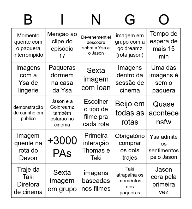 This bingo card has a free space and 24 words: +3000 PAs, Sexta imagem em grupo, Sexta imagem com Ioan, Traje da Taki Diretora de cinema, Tempo de espera de mais 15 min, Momento quente com o paquera interrompido, Imagens com a Ysa de lingerie, Menção ao clipe do episódio 17, Beijo em todas as rotas, Primeira interação Thomas e Taki, Imagens dentro da sessão de cinema, demonstração de carinho em público, Obrigatório comprar os dois trajes, Ysa admite os sentimentos pelo Jason, Paqueras dormem na casa da Ysa, Taki atrapalha os momentos dos paqueras, Quase acontece nsfw, Devenementiel descobre sobre a Ysa e o Jason, Uma das imagens é sem o paquera, Jason e a Goldreamz também estarão no cinema, Jason cora pela primeira vez, imagem quente na rota do Devon, imagem em grupo com a goldreamz (rota jason) and imagens baseadas nos filmes.
