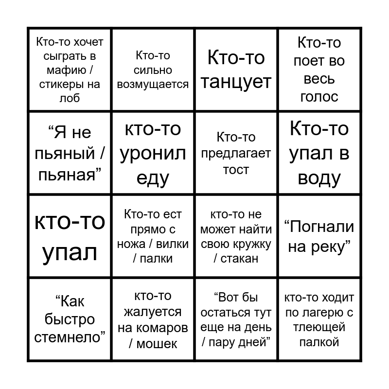This bingo card has 27 words: Кто-то испачкал футболку, Кто-то рыгнул, кто-то упал, кто-то облился алкоголем, кто-то уронил еду, Кто-то танцует, Кто-то сильно возмущается, кто-то ходит по лагерю с тлеющей палкой, кто-то жалуется на комаров / мошек, Кто-то пугается, кто-то не может найти свою кружку / стакан, Кто-то поет во весь голос, Кто-то устраивает танцы у костра, Пакет / салфетки уносит ветром, Кто-то ест прямо с ножа / вилки / палки, Кто-то включает музыку, а ему говорят переключи, Кто-то предлагает тост, Кто-то упал в воду, Кто-то предлагает идти за дровами, Кто-то хочет сыграть в мафию / стикеры на лоб, “Вот бы остаться тут еще на день / пару дней”, “Нужно будет еще раз сюда выбраться”, “Погнали на реку”, “Как быстро стемнело”, “Шикарная идея выбраться на природу”, “Я не пьяный / пьяная” and “Сосал?”.