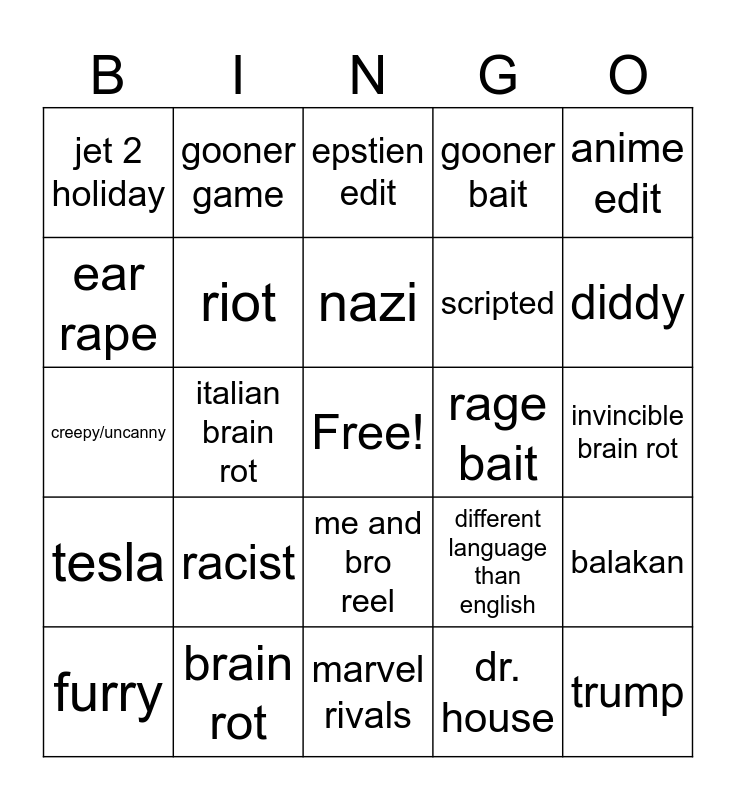 This bingo card has a free space and 24 words: racist, brain rot, nazi, furry, anime edit, jet 2 holiday, ear rape, gooner game, rage bait, me and bro reel, scripted, creepy/uncanny, different language than english, balakan, riot, dr. house, invincible brain rot, epstien edit, diddy, italian brain rot, trump, tesla, gooner bait and marvel rivals.