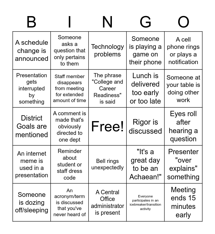 This bingo card has a free space and 33 words: Something is discussed that can easily be sent in an email, Someone announces that their part of the meeting will be quick, A comment is made that's obviously directed to one dept, Reminder about parent contact, An internet meme is used in a presentation, Staff member disappears from meeting for extended amount of time, A cell phone rings or plays a notification, Someone is dozing off/sleeping, Someone asks a question that only pertains to them, New initiative is discussed, The phrase "College and Career Readiness" is said, Technology problems, Pets are mentioned, "We want to make sure we get you out of here on time", Rigor is discussed, Someone at your table is doing other work, An acronym/term is discussed that you've never heard of, District Goals are mentioned, Reminder about student or staff dress code, "It's a great day to be an Achaean!", Bell rings unexpectedly, Presenter cannot answer a question, A schedule change is announced, Eyes roll after hearing a question, A Central Office administrator is present, Meeting ends 15 minutes early, Someone is playing a game on their phone, Lunch is delivered too early or too late, Presentation gets interrupted by something, Presenter "over explains" something, Someone makes reference to 20 year anniversary, Everyone participates in an icebreaker/transition activity and Someone asks a question about their schedule or class size.