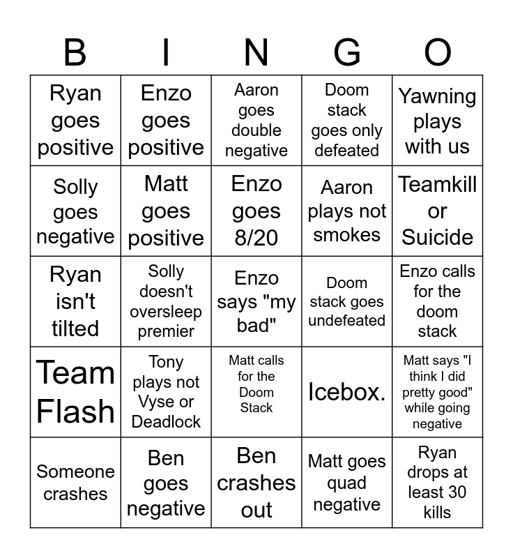 This bingo card has a free space and 24 words: Tony plays not Vyse or Deadlock, Ben goes negative, Enzo goes 8/20, Someone crashes, Yawning plays with us, Ryan goes positive, Solly goes negative, Enzo goes positive, Doom stack goes undefeated, Matt calls for the Doom Stack, Aaron plays not smokes, Ryan isn't tilted, Icebox., Matt says "I think I did pretty good" while going negative, Matt goes positive, Matt goes quad negative, Enzo calls for the doom stack, Aaron goes double negative, Teamkill or Suicide, Solly doesn't oversleep premier, Ryan drops at least 30 kills, Team Flash, Doom stack goes only defeated and Ben crashes out.