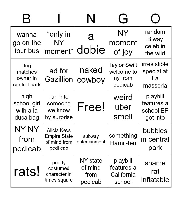 This bingo card has a free space and 24 words: Alicia Keys Empire State of mind from pedi cab, poorly costumed character in times square, naked cowboy, rats!, random B’way celeb in the wild, wanna go on the tour bus, dog matches owner in central park, “only in NY moment”, weird uber smell, subway entertainment, Taylor Swift welcome to ny from pedicab, high school girl with a la duca bag, something Hamil-ten, bubbles in central park, ad for Gazillion, playbill features a California school, playbill features a school EP got into, a dobie, irresistible special at La masseria, run into someone we know by surprise, shame rat inflatable, NY NY from pedicab, NY moment of joy and NY state of mind from pedicab.