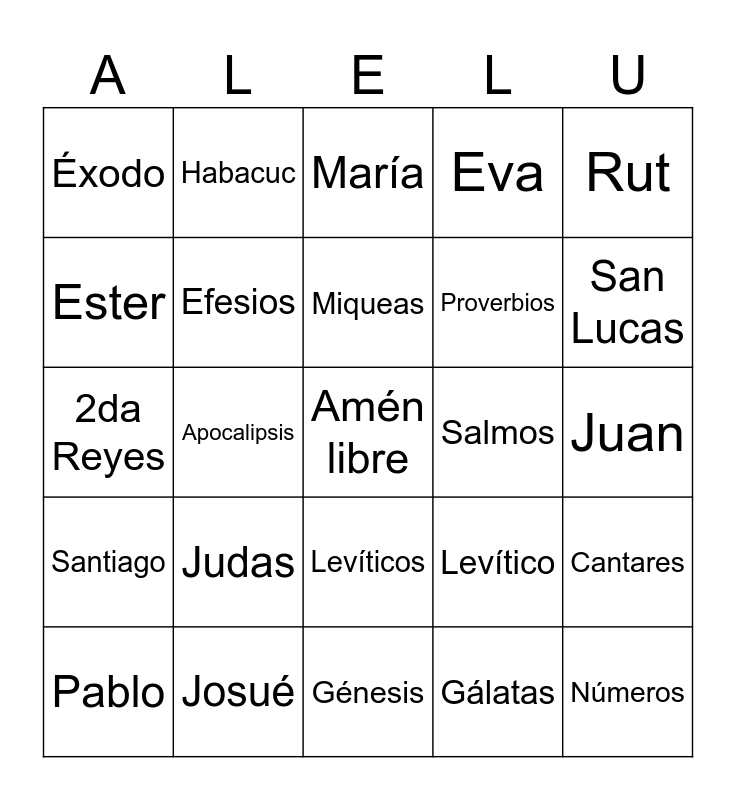 This bingo card has a free space and 31 words: Génesis, 1ra Samuel, Apocalipsis, Jesús, Éxodo, María, Efesios, Levítico, Salmos, Gálatas, Juan, Números, Hechos, Daniel, San Lucas, Deuteronomio, Cantares, Judas, Santiago, Levíticos, Rut, 1ra Crónicas, Pablo, Habacuc, Proverbios, Ester, Eva, 2da Reyes, Josué, Miqueas and San Marcos.