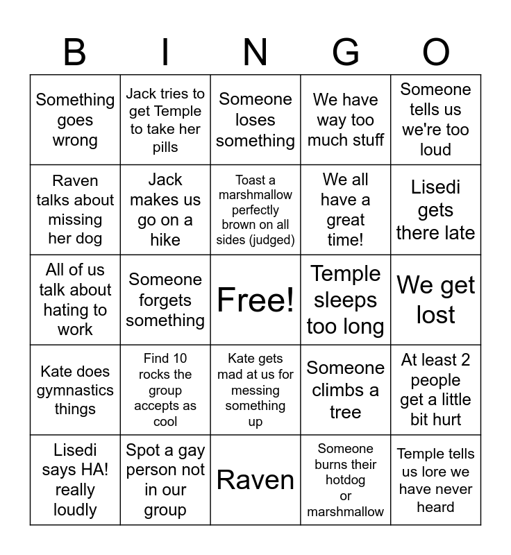 This bingo card has a free space and 24 words: Find 10 rocks the group accepts as cool, Spot a gay person not in our group, Toast a marshmallow perfectly brown on all sides (judged), Lisedi says HA! really loudly, Someone tells us we're too loud, Something goes wrong, Raven talks about missing her dog, Jack tries to get Temple to take her pills, Temple sleeps too long, Kate gets mad at us for messing something up, We all have a great time!, All of us talk about hating to work, Someone climbs a tree, At least 2 people get a little bit hurt, Jack makes us go on a hike, Someone burns their hotdog or marshmallow, We get lost, Someone loses something, Lisedi gets there late, Someone forgets something, Temple tells us lore we have never heard, Kate does gymnastics things, We have way too much stuff and Raven.