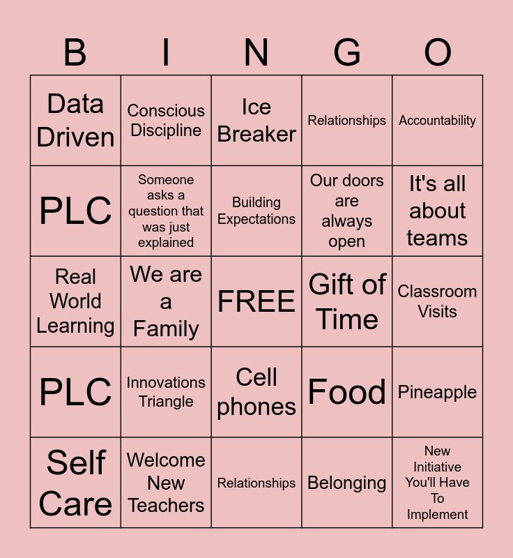 This bingo card has a free space and 29 words: Conscious Discipline, Welcome New Teachers, Ice Breaker, "Inspiring" Video, Accountability, Data Driven, Someone asks a question that was just explained, Building Expectations, Gift of Time, Pineapple, Self Care, We are a Family, Belonging, New Initiative You'll Have To Implement, Real World Learning, Vertical Team, Relationships, Food, It's all about teams, PLC, Innovations Triangle, Clear Communication, Our doors are always open, Classroom Visits, PLC, Conscious Discipline, Cell phones, Relationships and Family.