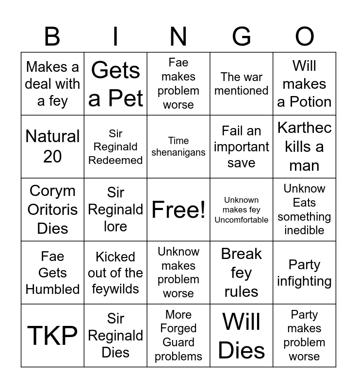 This bingo card has a free space and 34 words: Dad dies, Will Dies, Unknown lore drops, Get spied on, Idiot, Fae Gets Humbled, Sir Reginald Redeemed, Will makes a Potion, TKP, Gets a Pet, Party makes problems, Time shenanigans, Fae makes problem worse, Party locks in, Befriends the Fey, Unknown makes fey Uncomfortable, Karthec kills a man, Sir Reginald Dies, Corym Oritoris Dies, Kicked out of the feywilds, Break fey rules, Unknow makes problem worse, Unknown Dies, Makes a deal with a fey, Unknow Eats something inedible, More Forged Guard problems, Party makes problem worse, The war mentioned, Weird fey magic, Fail an important save, Natural 20, Natural 1, Sir Reginald lore, Party infighting and Learn more about the plot.