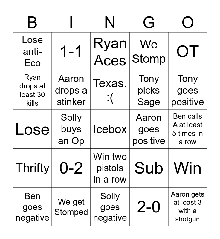 This bingo card has a free space and 24 words: 0-2, We get Stomped, Texas. :(, Ben goes negative, OT, Lose anti-Eco, Ryan drops at least 30 kills, 1-1, Aaron goes positive, Win two pistols in a row, Tony picks Sage, Lose, Sub, Win, Aaron drops a stinker, 2-0, Ben calls A at least 5 times in a row, Ryan Aces, Tony goes positive, Solly buys an Op, Aaron gets at least 3 with a shotgun, Thrifty, We Stomp and Solly goes negative.