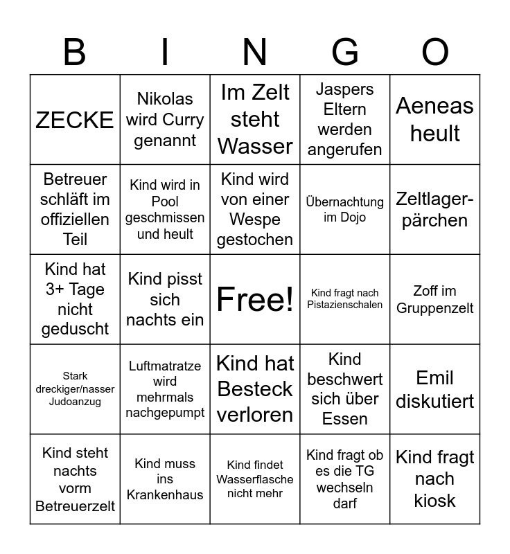 This bingo card has a free space and 32 words: Kind fragt ob es die TG wechseln darf, Kind wird abgeholt, Kind pisst sich nachts ein, Kind kotzt, Stark dreckiger/nasser Judoanzug, Kind wird in Pool geschmissen und heult, Aeneas heult, Emil diskutiert, Nikolas wird Curry genannt, Mittagessen wird auf dem Weg fallen gelassen, Kind wird von einer Wespe gestochen, Im Zelt steht Wasser, Kinder beschweren sich, weil Betreuer das Klo blockieren, Kind bekommt Klodienst, Kind fragt nach Pistazienschalen, Dreckige Füße beim Training, Kind steht nachts vorm Betreuerzelt, Kind hat 3+ Tage nicht geduscht, Kind hat Besteck verloren, Luftmatratze wird mehrmals nachgepumpt, Kind beschwert sich über Essen, Kind verschläft Frühstückstart, Zoff im Gruppenzelt, Kind muss ins Krankenhaus, Kind fragt nach kiosk, Jaspers Eltern werden angerufen, Übernachtung im Dojo, Betreuer schläft im offiziellen Teil, ZECKE, Kind findet Wasserflasche nicht mehr, Weg reißt and Zeltlager-pärchen.