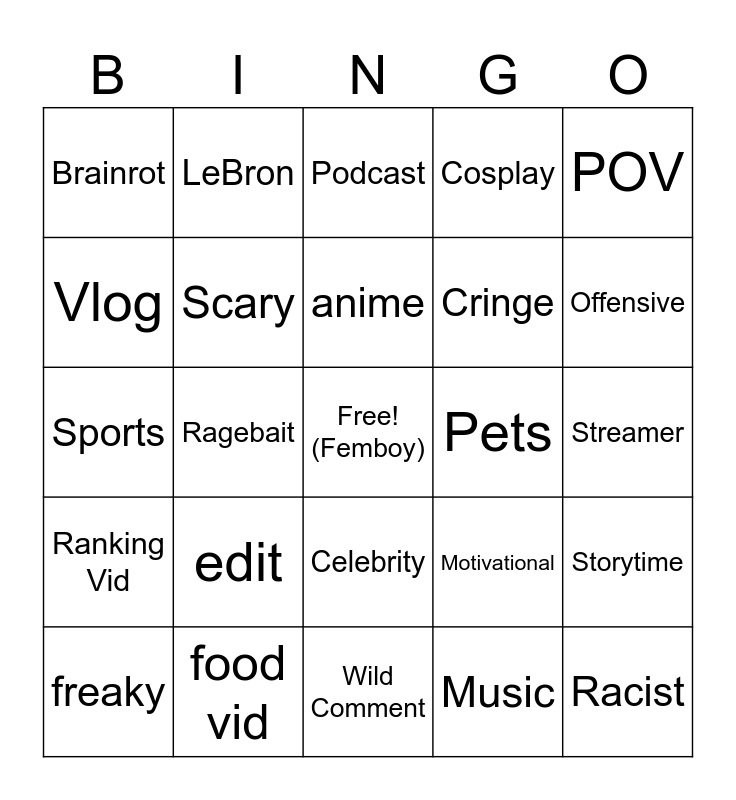 This bingo card has a free space and 24 words: edit, food vid, anime, freaky, POV, Brainrot, Vlog, LeBron, Pets, Celebrity, Cringe, Sports, Motivational, Storytime, Scary, Music, Streamer, Podcast, Offensive, Ragebait, Racist, Ranking Vid, Cosplay and Wild Comment.