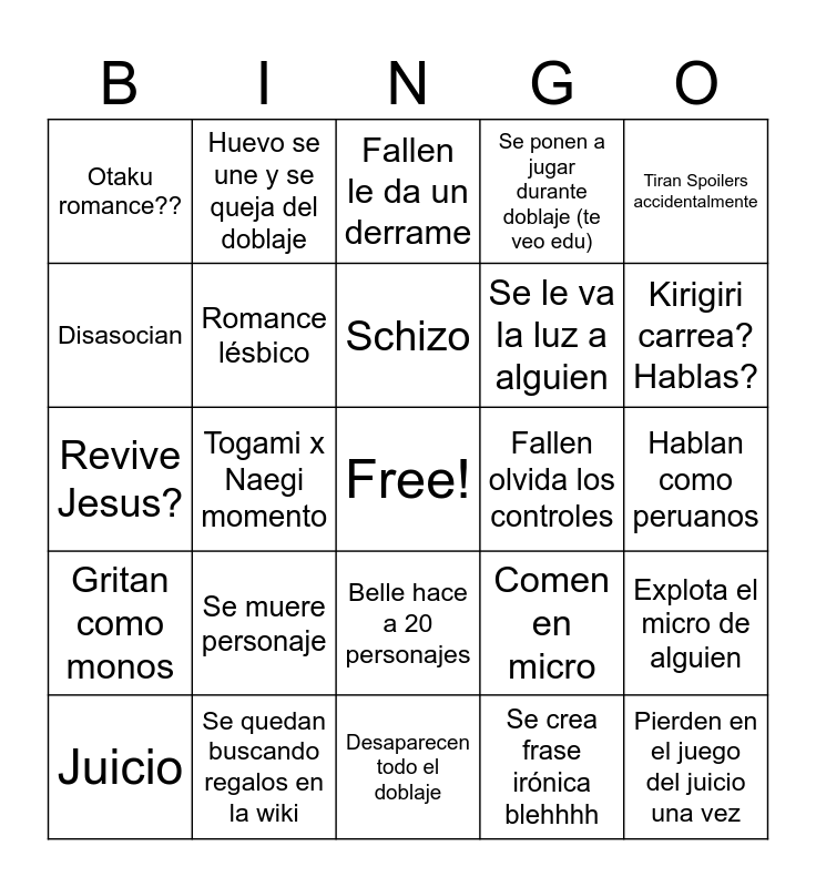This bingo card has a free space and 24 words: Se muere personaje, Se quedan buscando regalos en la wiki, Schizo, Juicio, Tiran Spoilers accidentalmente, Otaku romance??, Disasocian, Huevo se une y se queja del doblaje, Fallen olvida los controles, Belle hace a 20 personajes, Se le va la luz a alguien, Revive Jesus?, Comen en micro, Explota el micro de alguien, Romance lésbico, Se crea frase irónica blehhhh, Hablan como peruanos, Fallen le da un derrame, Kirigiri carrea? Hablas?, Togami x Naegi momento, Pierden en el juego del juicio una vez, Gritan como monos, Se ponen a jugar durante doblaje (te veo edu) and Desaparecen todo el doblaje.