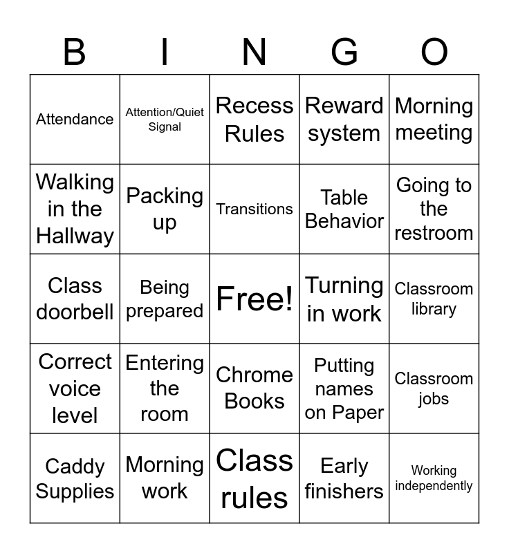 This bingo card has a free space and 24 words: Entering the room, Morning work, Transitions, Caddy Supplies, Morning meeting, Attendance, Walking in the Hallway, Attention/Quiet Signal, Turning in work, Chrome Books, Table Behavior, Class doorbell, Putting names on Paper, Classroom jobs, Packing up, Early finishers, Classroom library, Recess Rules, Going to the restroom, Being prepared, Working independently, Correct voice level, Reward system and Class rules.