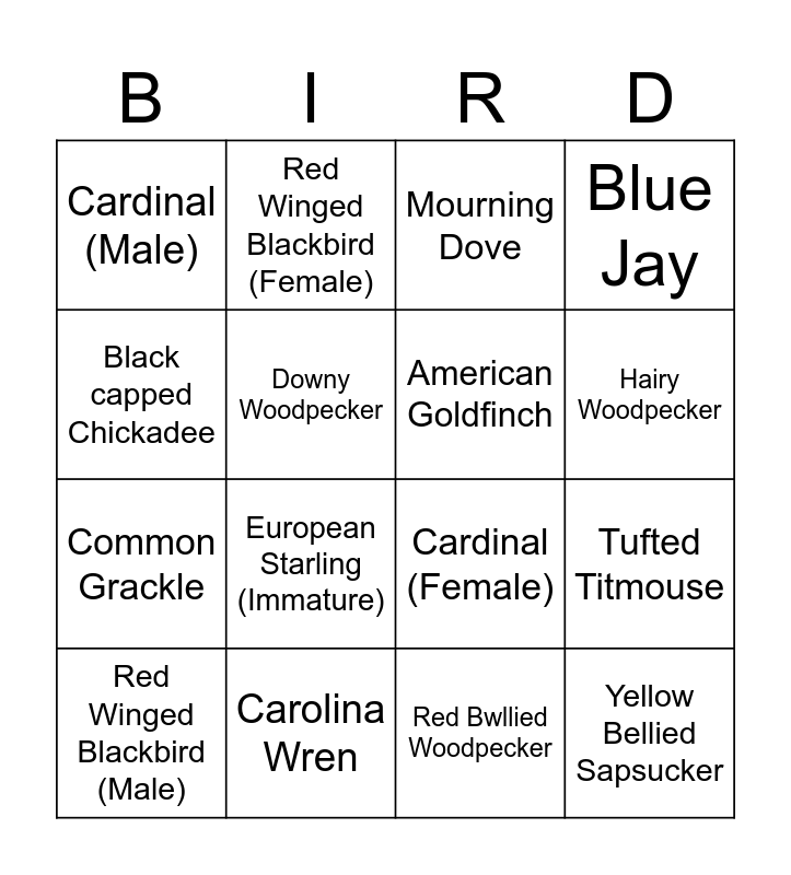 This bingo card has 18 words: European Starling (Immature), Yellow Bellied Sapsucker, Mourning Dove, Cardinal (Male), Cardinal (Female), Blue Jay, Red Winged Blackbird (Male), Red Winged Blackbird (Female), Hairy Woodpecker, Common Grackle, Red Bwllied Woodpecker, Black capped Chickadee, Tufted Titmouse, Downy Woodpecker, American Goldfinch, Dark eyed Junco, Carolina Wren and Other Bird.