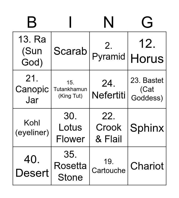 This bingo card has 1 images and 81 words: Free!, 1. Pharaoh, 2. Pyramid, 3. Mummy, 4. Sphinx, 5. Nile, 6. Scarab, 7. Hieroglyph, 8. Tomb, 9. Anubis, 10. Osiris, 11. Isis, 12. Horus, 13. Ra (Sun God), 14. Cleopatra, 15. Tutankhamun (King Tut), 16. Sarcophagus, 17. Papyrus, 18. Obelisk, 19. Cartouche, 20. Amulet, 21. Canopic Jar, 22. Crook & Flail, 23. Bastet (Cat Goddess), 24. Nefertiti, 25. Ramses, 26. Delta, 27. Oasis, 28. Eye of Horus, 29. Ankh, 30. Lotus Flower, 31. Chariot, 32. Scribe, 33. Vizier, 34. Hyksos, 35. Rosetta Stone, 36. Shaduf (irrigation tool), 37. Ushabti (funerary figurine), 38. Wadjet (protective goddess), 39. Kohl (eyeliner), 40. Desert, Pharaoh, Pyramid, Mummy, Sphinx, Nile, Scarab, Hieroglyph, Tomb, Anubis, Osiris, Isis, Horus, Ra (Sun God), Cleopatra, Tutankhamun (King Tut), Sarcophagus, Papyrus, Obelisk, Cartouche, Amulet, Canopic Jar, Crook & Flail, Bastet (Cat Goddess), Nefertiti, Ramses, Delta, Oasis, Eye of Horus, Ankh, Lotus Flower, Chariot, Scribe, Vizier, Hyksos, Rosetta Stone, Shaduf (irrigation tool), Ushabti (funerary figurine), Wadjet (protective goddess), Kohl (eyeliner) and Desert.