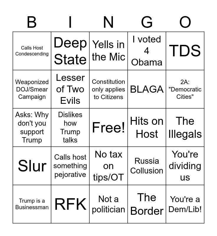 This bingo card has a free space and 58 words: Hunter Biden's Laptop, RFK, But Biden!, Slur, The Border, Pro-Life, Lesser of Two Evils, White Savior, BLAGA, Mispronounced Kamala, I voted 4 Obama, Men in women's sports, Two genders, Calls Trump Daddy, Free Speech, Calls Host Condescending, You're a Dem/Lib!, TDS, Riley (L/G), Constitution only applies to Citizens, Hits on Host, Yells in the Mic, Trump is a Businessman, You're dividing us, What did Kamala do?, The Illegals, Bitcoin/Crypto, 2nd Amendment, 2A: "Democratic Cities", Men are better leaders, Kamala's laugh, World leaders respect him, Supporting Israel, Stolen Elections, Child caller, Brings up Christianity, Inflation, Dislikes how Trump talks, Asks: Why don't you support Trump, Indoctrinating kids, Calls host something pejorative, Interrupts Host, Russia Collusion, Thanks Obama, Fake news, Afghanistan withdrawal, "Hand outs", No tax on tips/OT, Not a politician, The Debt!, "Aligns with my morals", "I used to be a democrat", Socialism, Communism, Deep State, "Liberal" Media, Weaponized DOJ/Smear Campaign and NATO.