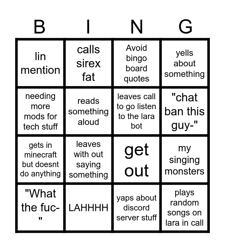 This bingo card has 16 words: LAHHHH, my singing monsters, Avoid bingo board quotes, lin mention, gets in minecraft but doesnt do anything, calls sirex fat, get out, yaps about discord server stuff, needing more mods for tech stuff, reads something aloud, "What the fuc-", yells about something, leaves with out saying something, "chat ban this guy-", leaves call to go listen to the lara bot and plays random songs on lara in call.