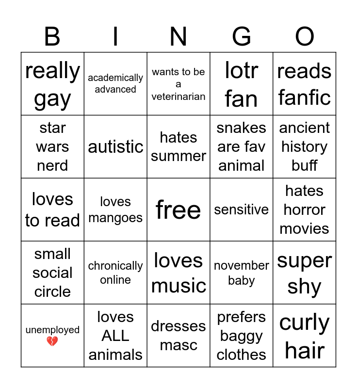 This bingo card has a free space and 24 words: chronically online, loves ALL animals, hates summer, unemployed 💔, reads fanfic, really gay, star wars nerd, academically advanced, sensitive, loves music, snakes are fav animal, loves to read, november baby, super shy, autistic, prefers baggy clothes, hates horror movies, wants to be a veterinarian, ancient history buff, loves mangoes, curly hair, small social circle, lotr fan and dresses masc.