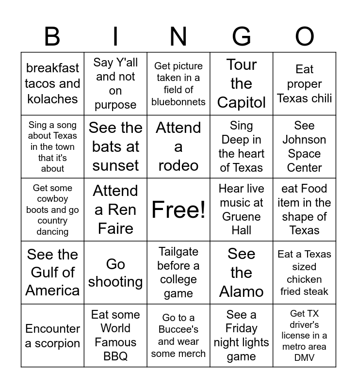 This bingo card has a free space and 24 words: Go shooting, Eat some World Famous BBQ, Attend a rodeo, Encounter a scorpion, Eat proper Texas chili, breakfast tacos and kolaches, Sing a song about Texas in the town that it's about, Say Y'all and not on purpose, Hear live music at Gruene Hall, Tailgate before a college game, Sing Deep in the heart of Texas, Get some cowboy boots and go country dancing, See the Alamo, Eat a Texas sized chicken fried steak, See the bats at sunset, See a Friday night lights game, eat Food item in the shape of Texas, Get picture taken in a field of bluebonnets, See Johnson Space Center, Attend a Ren Faire, Get TX driver's license in a metro area DMV, See the Gulf of America, Tour the Capitol and Go to a Buccee's and wear some merch.