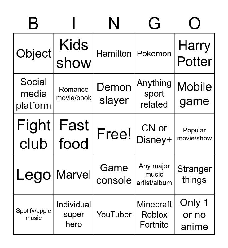 This bingo card has a free space and 24 words: Marvel, Individual super hero, Demon slayer, Spotify/apple music, Harry Potter, Object, Social media platform, Kids show, CN or Disney+, Game console, Anything sport related, Fight club, Any major music artist/album, Stranger things, Romance movie/book, Minecraft Roblox Fortnite, Popular movie/show, Hamilton, Mobile game, Fast food, Only 1 or no anime, Lego, Pokemon and YouTuber.