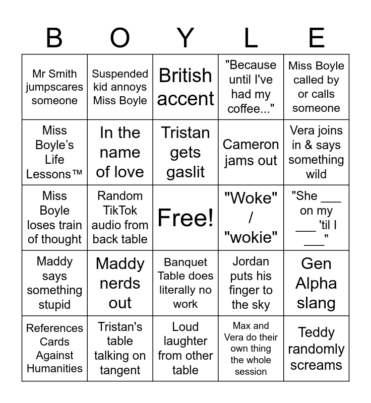 This bingo card has a free space and 30 words: Tristan's table talking on tangent, Tristan says something stupid, Random TikTok audio from back table, S02 gets WAY too loud, Mr Smith jumpscares someone, British accent, In the name of love, Banquet Table does literally no work, "Woke" / "wokie", Loud laughter from other table, "She ___ on my ___ 'til I ___", Teddy randomly screams, Max and Vera do their own thing the whole session, Vera watches Twitch, Vera joins in & says something wild, Riddler laugh, Jordan puts his finger to the sky, Maddy says something stupid, Maddy nerds out, Miss Boyle called by or calls someone, Miss Boyle loses train of thought, Miss Boyle tells a story about NZ, Suspended kid annoys Miss Boyle, Cameron jams out, Miss Boyle’s Life Lessons™, "Because until I've had my coffee...", Gen Alpha slang, References Cards Against Humanities, Tristan gets gaslit and Jordan speaks fake Japanese.