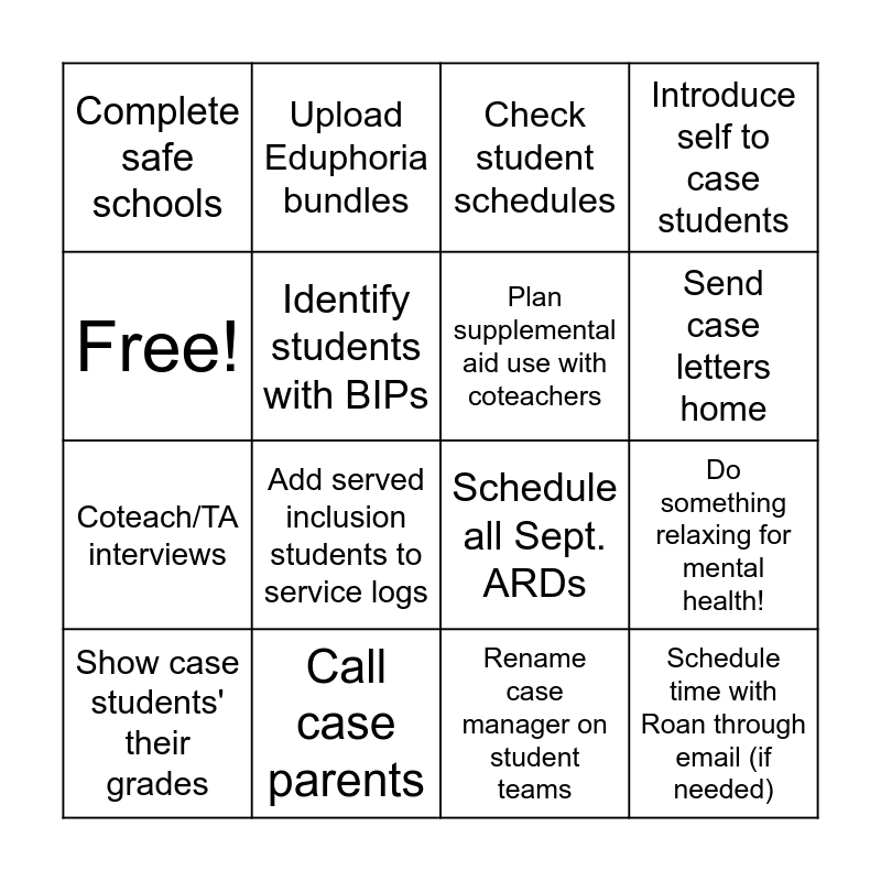 This bingo card has 16 words: Call case parents, Do something relaxing for mental health!, Check student schedules, Complete safe schools, Coteach/TA interviews, Upload Eduphoria bundles, Schedule all Sept. ARDs, Rename case manager on student teams, Free!, Identify students with BIPs, Show case students' their grades, Introduce self to case students, Add served inclusion students to service logs, Send case letters home, Plan supplemental aid use with coteachers and Schedule time with Roan through email (if needed).