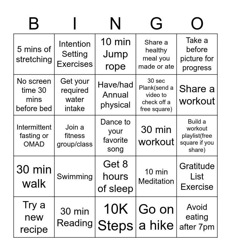 This bingo card has a free space and 24 words: Swimming, 30 min Reading, Have/had Annual physical, Try a new recipe, Take a before picture for progress, 5 mins of stretching, No screen time 30 mins before bed, Intention Setting Exercises, 30 min workout, Get 8 hours of sleep, 30 sec Plank(send a video to check off a free square), Intermittent fasting or OMAD, 10 min Meditation, Gratitude List Exercise, Get your required water intake, Go on a hike, Build a workout playlist(free square if you share), 10 min Jump rope, Share a workout, Join a fitness group/class, Avoid eating after 7pm, 30 min walk, Share a healthy meal you made or ate and 10K Steps.