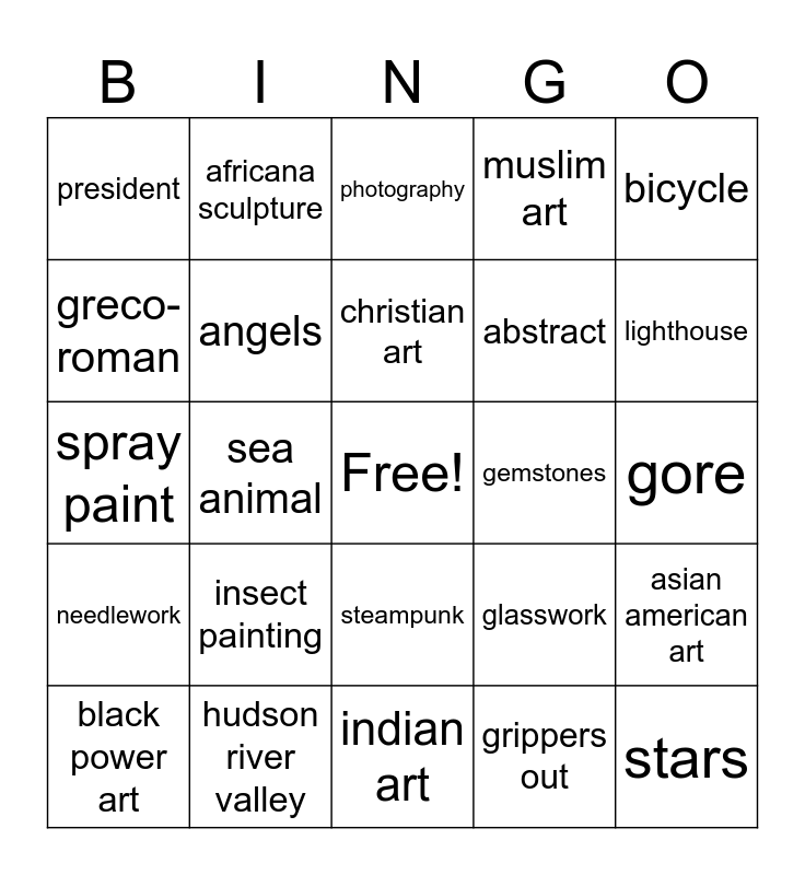 This bingo card has a free space and 24 words: insect painting, hudson river valley, christian art, black power art, bicycle, president, greco-roman, africana sculpture, gemstones, steampunk, abstract, spray paint, glasswork, asian american art, angels, grippers out, gore, photography, lighthouse, sea animal, stars, needlework, muslim art and indian art.