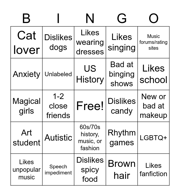 This bingo card has a free space and 24 words: Autistic, Speech impediment, US History, Likes unpopular music, Music forums/rating sites, Cat lover, Anxiety, Dislikes dogs, Dislikes candy, 60s/70s history, music, or fashion, Bad at binging shows, Magical girls, Rhythm games, LGBTQ+, Unlabeled, Brown hair, New or bad at makeup, Likes wearing dresses, Likes school, 1-2 close friends, Likes fanfiction, Art student, Likes singing and Dislikes spicy food.