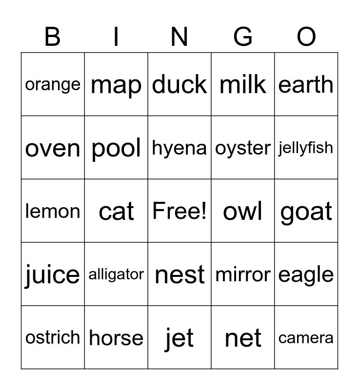 This bingo card has a free space and 84 words: dolphin, dice, duck, dog, deer, penguin, popsicle, pumpkin, pig, pencil, piano, pineapple, pool, owl, octopus, orange, ostrich, oven, olive, onion, otter, oyster, camera, cake, cat, carrot, bear, banana, bicycle, apple, alligator, astronaut, llama, lemon, lion, ladybug, jet, jeans, jellyfish, juice, igloo, iguana, ice cream, island, mouse, monkey, map, money, mushroom, moon, mango, mirror, milk, hippo, helicopter, heart, horse, hyena, happy, goat, guitar, flamingo, frog, fish, fox, elephant, egg, ear, earth, eye, eagle, eggplant, nurse, nut, nest, net, newspaper, nose, notebook, night, kangaroo, kiss, koala and king.